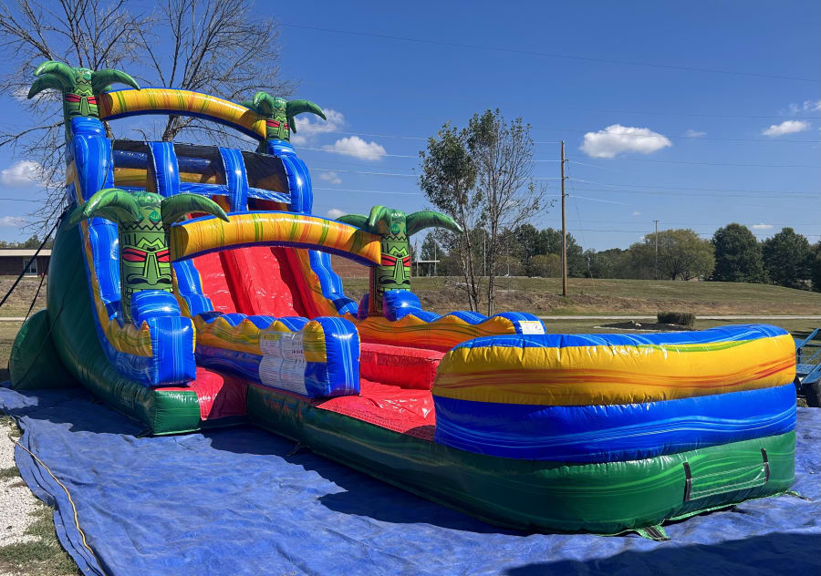 This Dual Lane Slide is the perfect addition to your Summer Events! It features two WIDE lanes down a long slide that is soaked by our misting system and has a massive pool at the bottom!