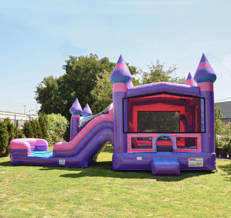 This bounce combo is amongst our most popular inflatables! It has a pink / purple theme! This combo has a bounce area, and a water slide! The slide can be used as a dry slide if preferred!
